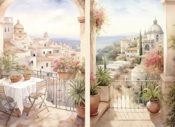 Plakatas Saulėlydis balkone, architektūra, žydinčios gėlės, akvarelės stilius, Viduržemio jūros regionas Ne d00420