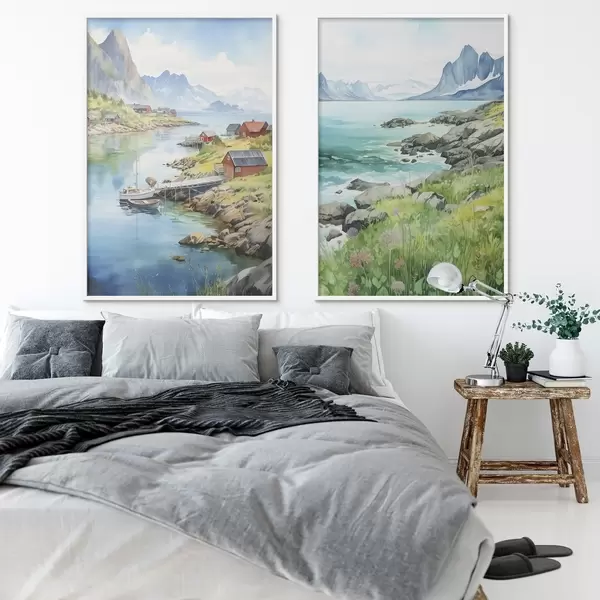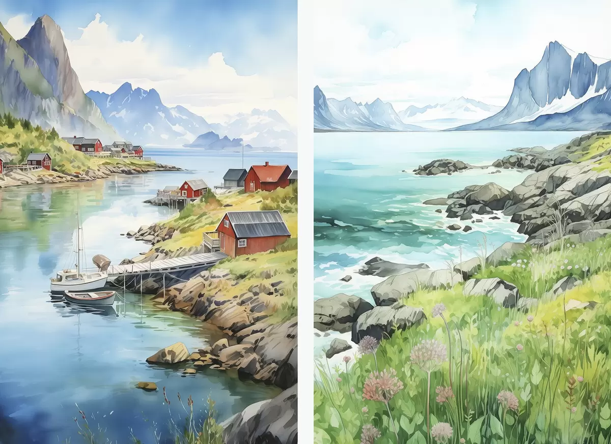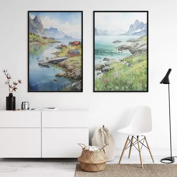 Plakatas Norvegijos gamta, Lofoteno salos, vasaros kraštovaizdis, raudoni namai, kalnai, valtys Ne d00421