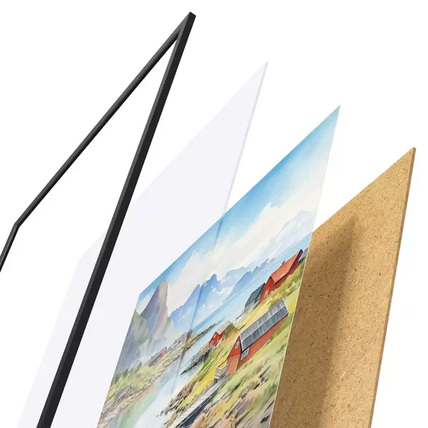 Plakatą sudaro rėmas, pleksiklas, atspausdintas vaizdas ir medžio drožlių plokštės pagrindas. Plakatą galima iš karto pakabinti ant sienos dėl kitoje pusėje esančių laikiklių.
