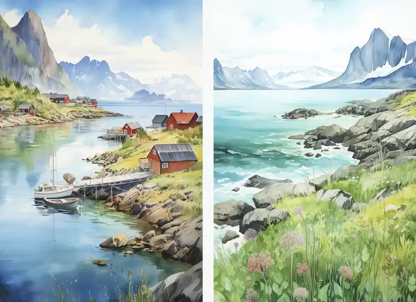 Plakatas Norvegijos gamta, Lofoteno salos, vasaros kraštovaizdis, raudoni namai, kalnai, valtys d00421