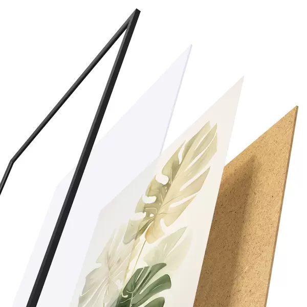 Plakatą sudaro rėmas, pleksiklas, atspausdintas vaizdas ir medžio drožlių plokštės pagrindas. Plakatą galima iš karto pakabinti ant sienos dėl kitoje pusėje esančių laikiklių.
