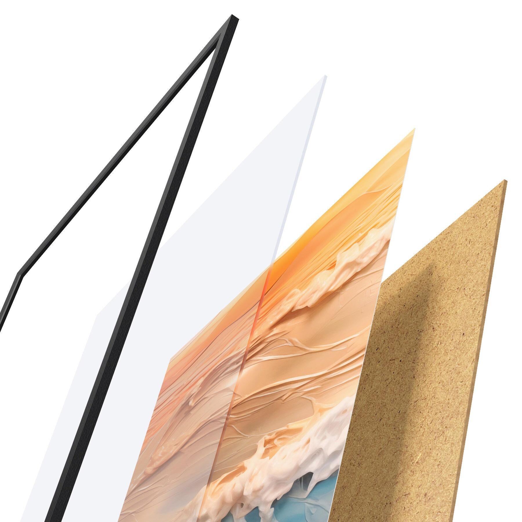Plakatą sudaro rėmas, pleksiklas, atspausdintas vaizdas ir medžio drožlių plokštės pagrindas. Plakatą galima iš karto pakabinti ant sienos dėl kitoje pusėje esančių laikiklių.