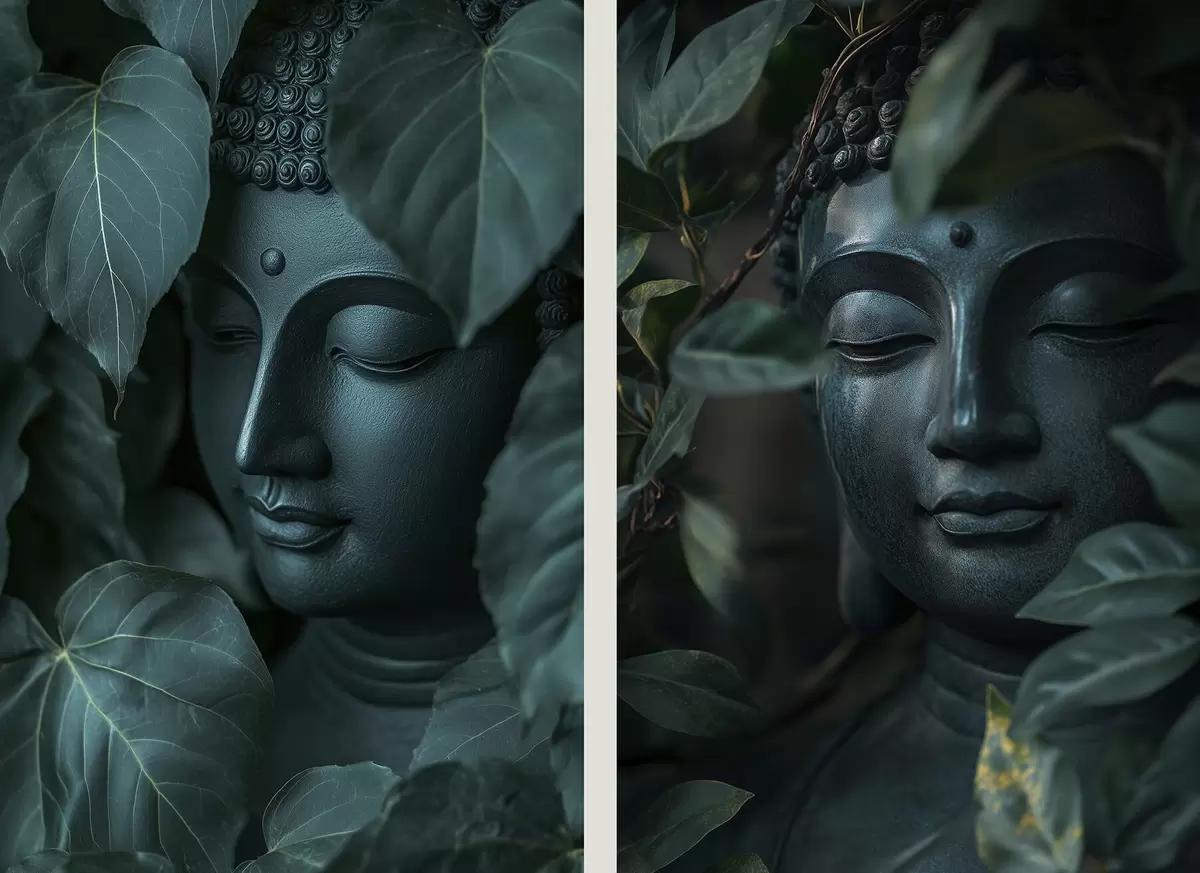Plakatas Meditacinis Buda žaliuose lapuose, budizmas, atogrąžų, realizmas Ne d00447
