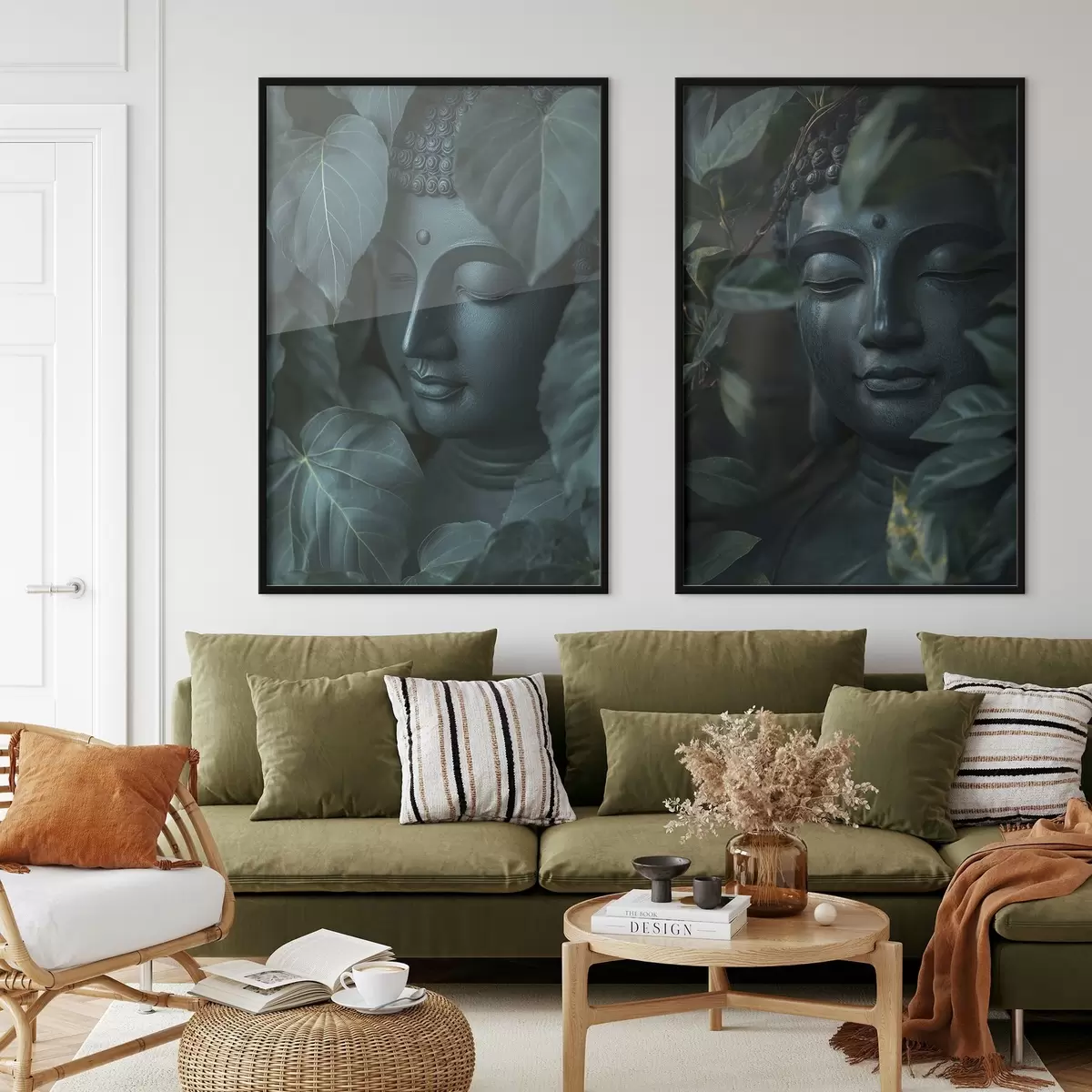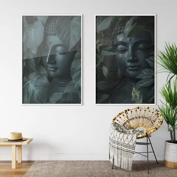 Plakatas Meditacinis Buda žaliuose lapuose, budizmas, atogrąžų, realizmas d00447