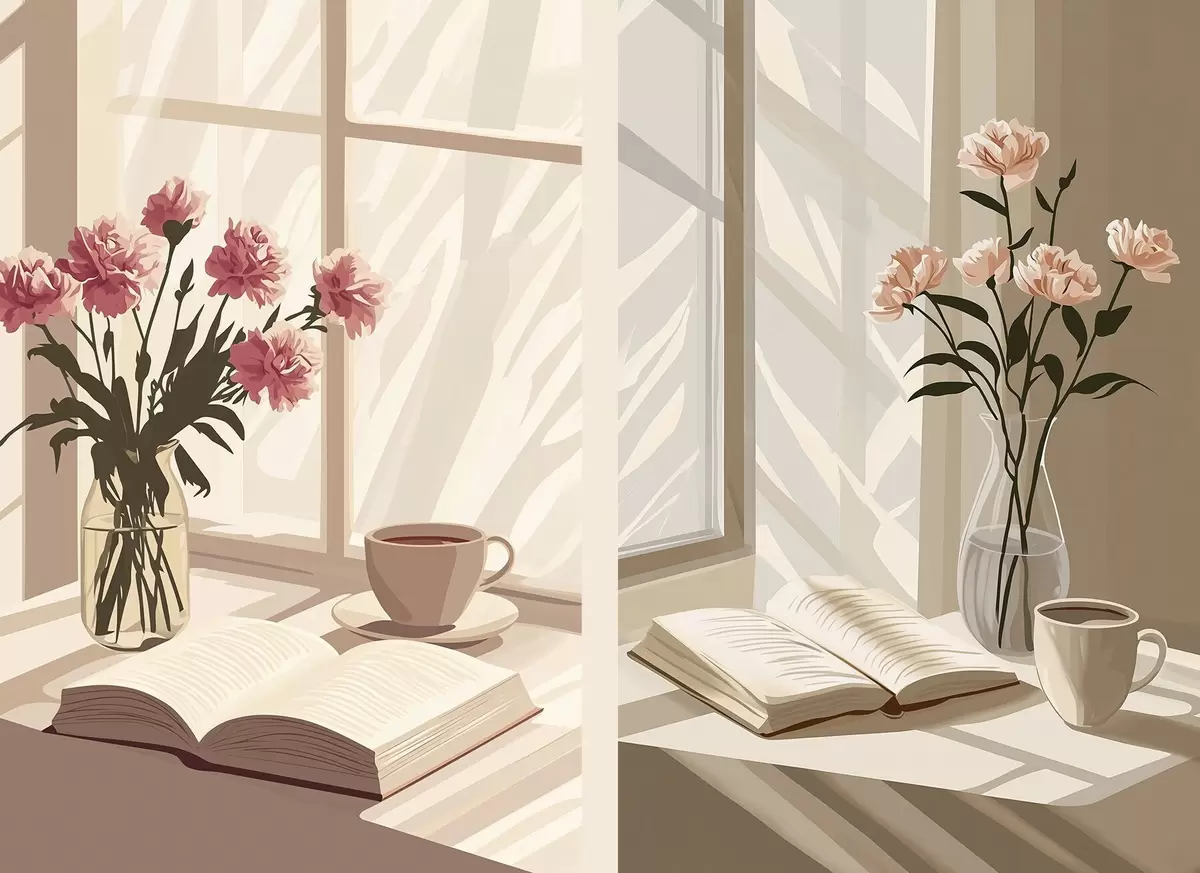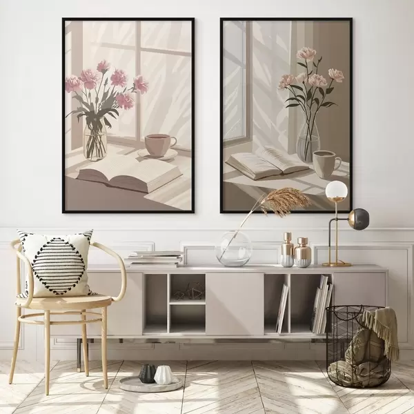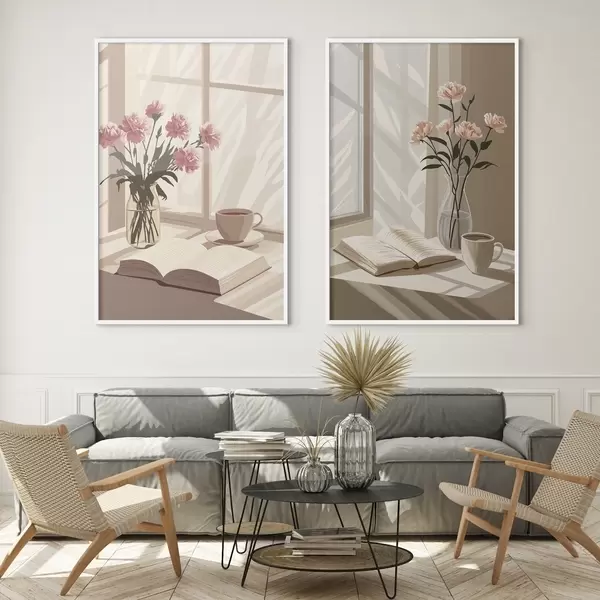 Plakatas Abstrakcija, rytinė estetika, kavos puodelis, knyga, gėlės d00448