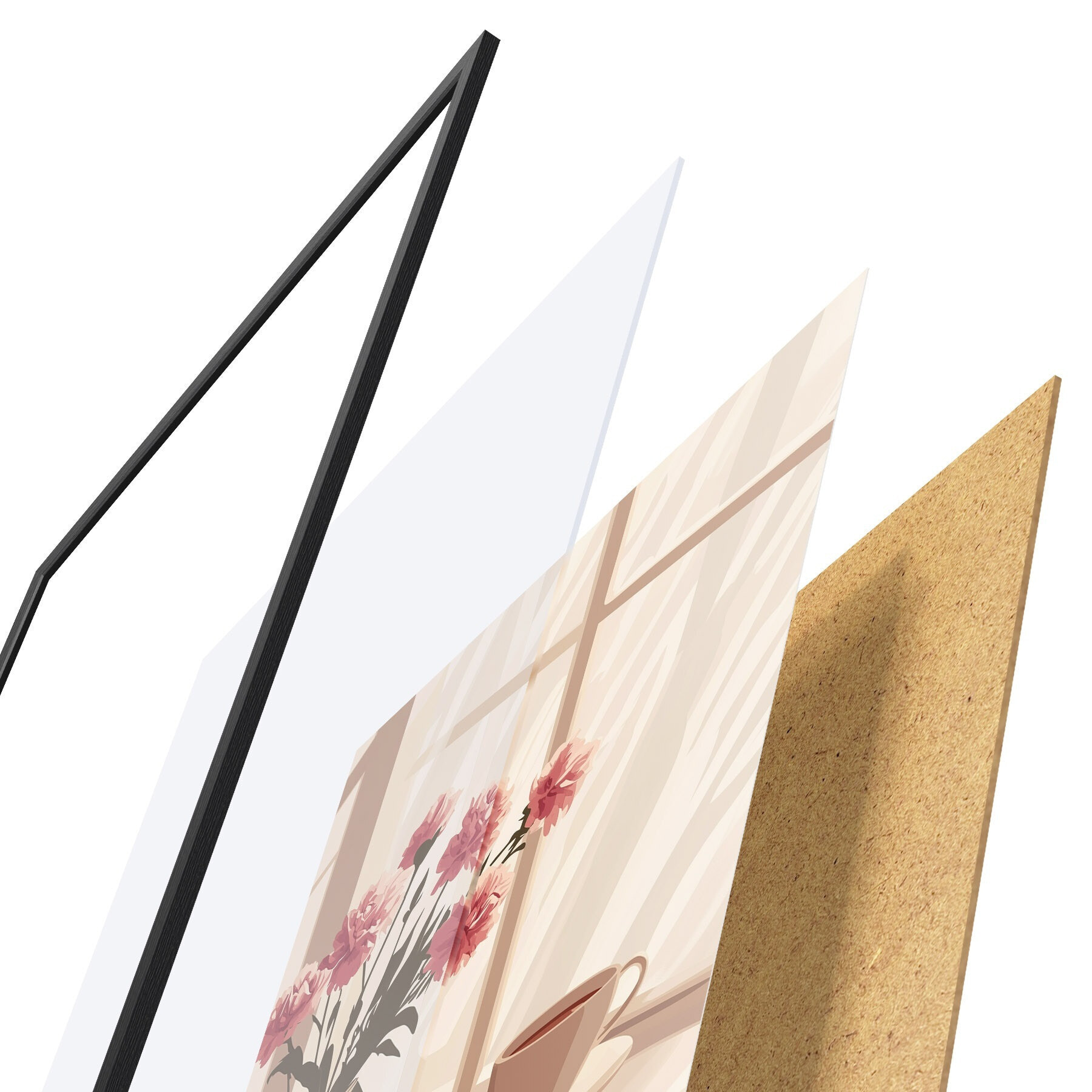 Plakatą sudaro rėmas, pleksiklas, atspausdintas vaizdas ir medžio drožlių plokštės pagrindas. Plakatą galima iš karto pakabinti ant sienos dėl kitoje pusėje esančių laikiklių.