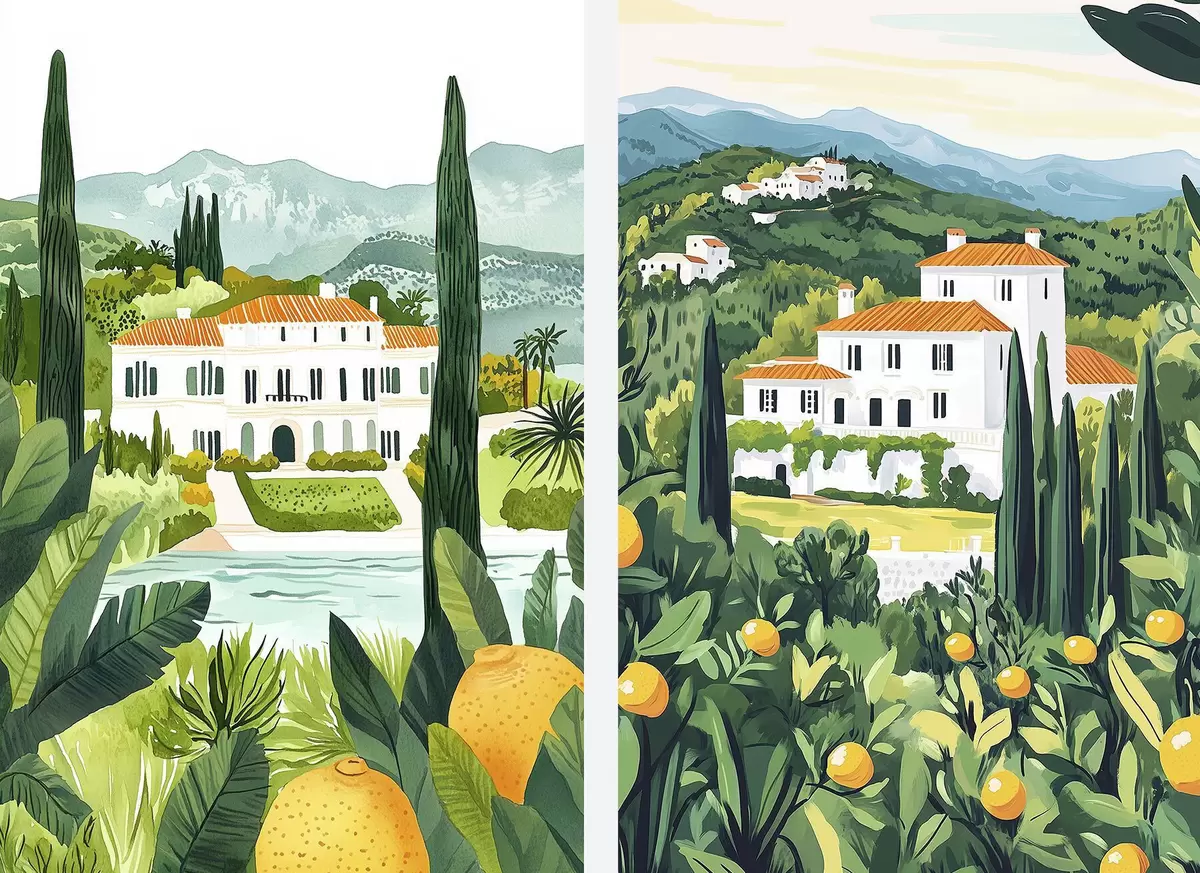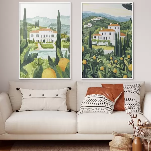 Plakatas Viduržemio jūros kraštovaizdis su medžiais ir namais, jūros pakrantė, Ispanija d00450