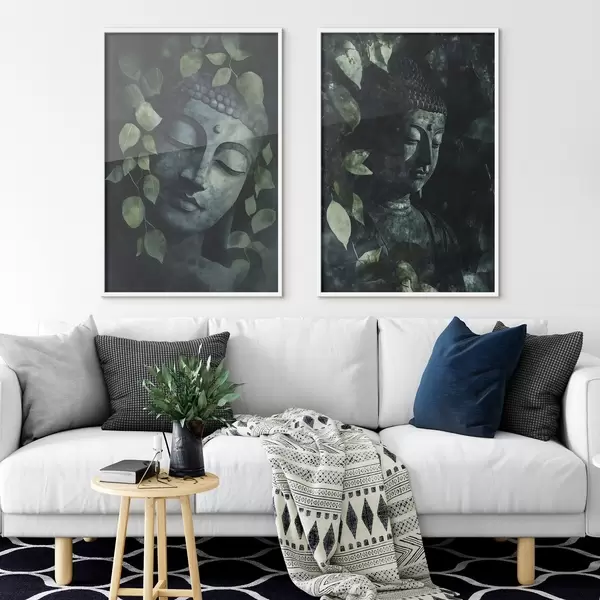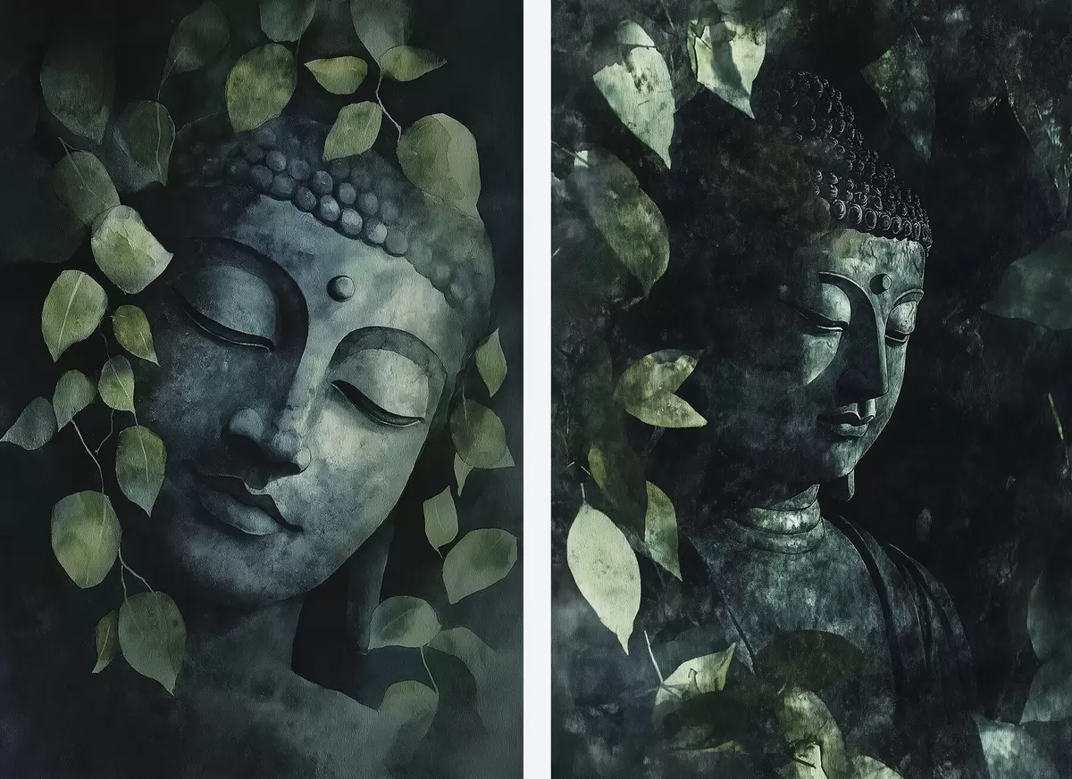 Plakatas Žalias Buda atogrąžų lapuose, akvarelės stilius d00451