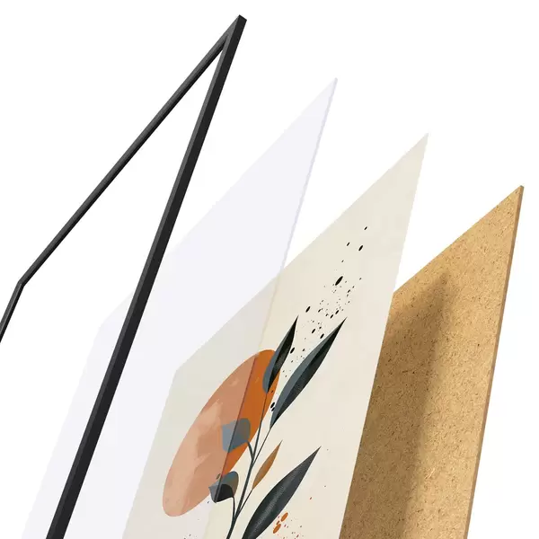 Plakatą sudaro rėmas, pleksiklas, atspausdintas vaizdas ir medžio drožlių plokštės pagrindas. Plakatą galima iš karto pakabinti ant sienos dėl kitoje pusėje esančių laikiklių.