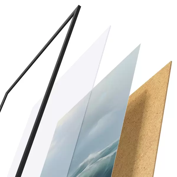 Plakatą sudaro rėmas, pleksiklas, atspausdintas vaizdas ir medžio drožlių plokštės pagrindas. Plakatą galima iš karto pakabinti ant sienos dėl kitoje pusėje esančių laikiklių.