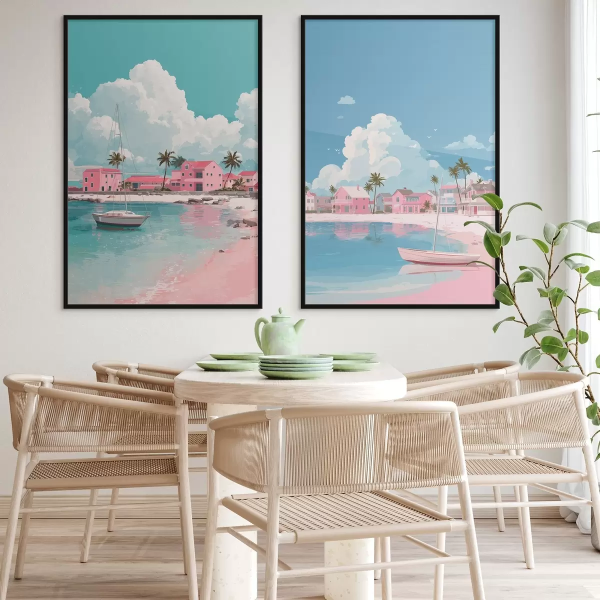 Plakatas Rožinis vasaros paplūdimys su saule, burlaiviu ir namais d00479