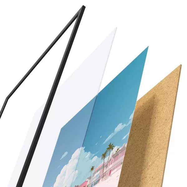 Plakatą sudaro rėmas, pleksiklas, atspausdintas vaizdas ir medžio drožlių plokštės pagrindas. Plakatą galima iš karto pakabinti ant sienos dėl kitoje pusėje esančių laikiklių.