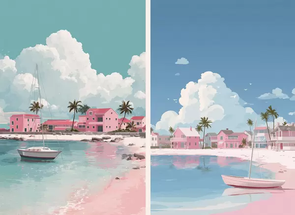 Plakatas Rožinis vasaros paplūdimys su saule, burlaiviu ir namais d00479