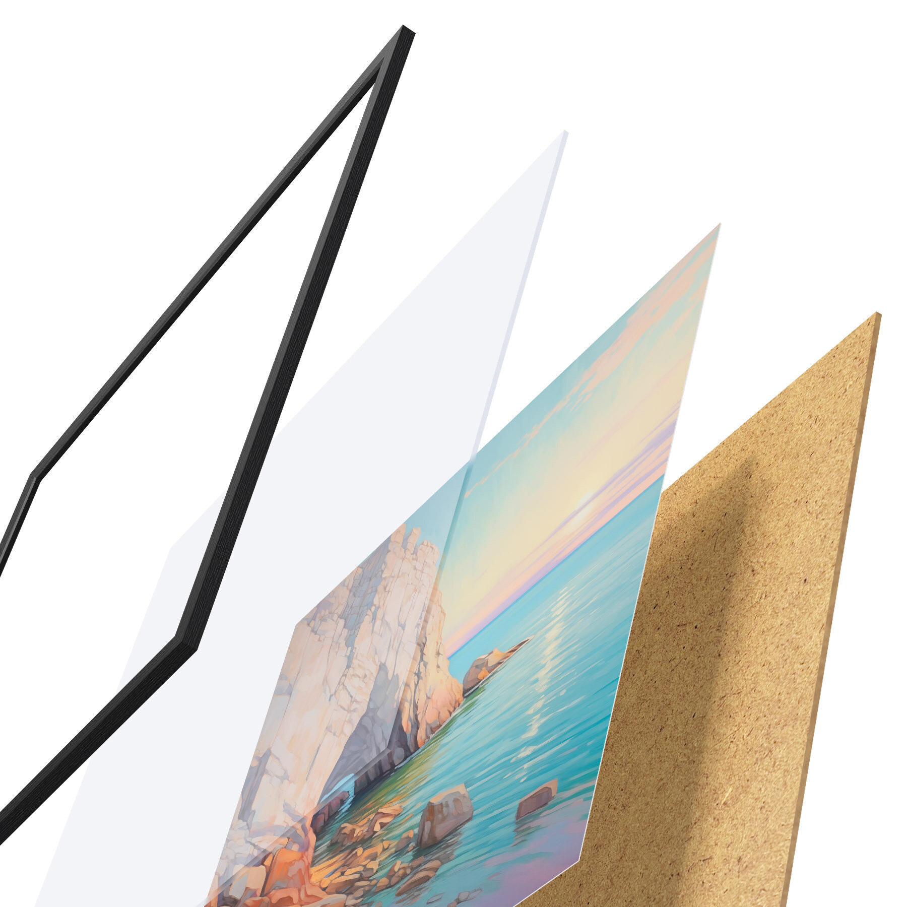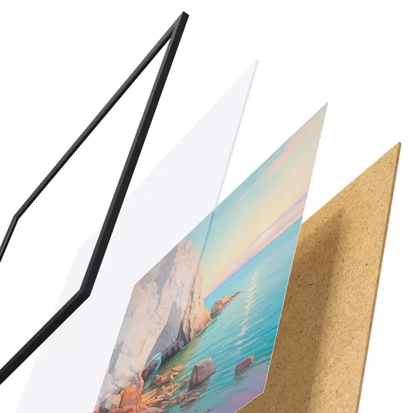 Plakatą sudaro rėmas, pleksiklas, atspausdintas vaizdas ir medžio drožlių plokštės pagrindas. Plakatą galima iš karto pakabinti ant sienos dėl kitoje pusėje esančių laikiklių.