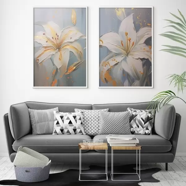 Plakatas Baltos lelijos su geltonais brūkšneliais mėlyname fone d00497