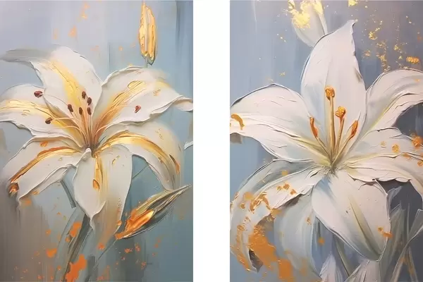 Plakatas Baltos lelijos su geltonais brūkšneliais mėlyname fone d00497