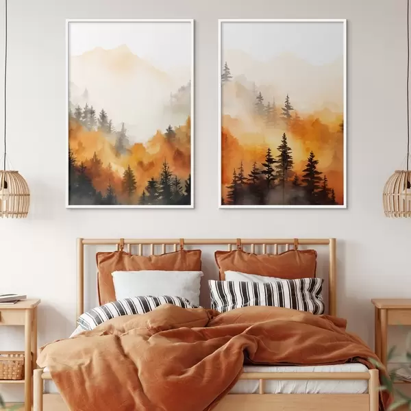 Plakatas Peizažo akvarele tapyba, imituojanti mišką su aukštomis pušimis ir kalnais fone Ne d00519