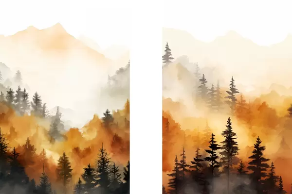 Plakatas Peizažo akvarele tapyba, imituojanti mišką su aukštomis pušimis ir kalnais fone d00519
