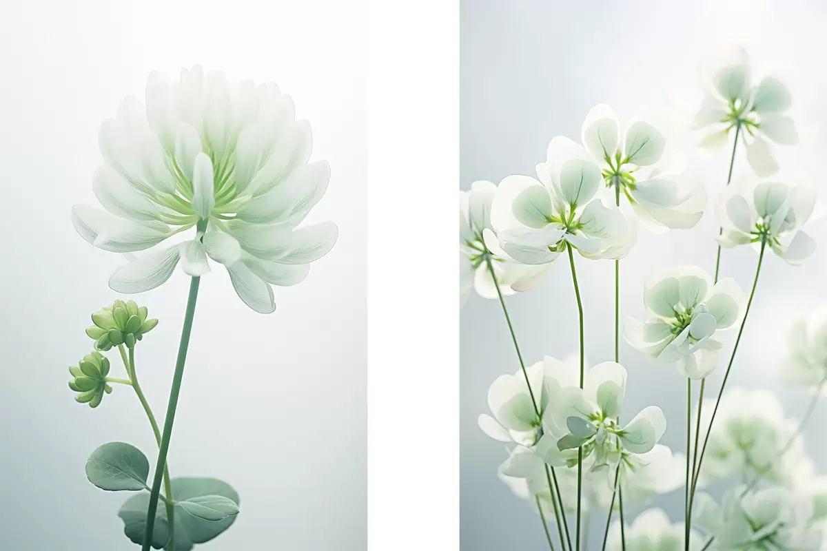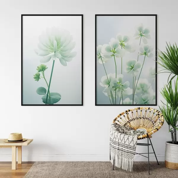 Plakatas Baltų dobilų gėlės su žaliu stiebu ir lapais, minkštas apšvietimas, švarus fonas, minimalistinė kompozicija, botaninis d00520