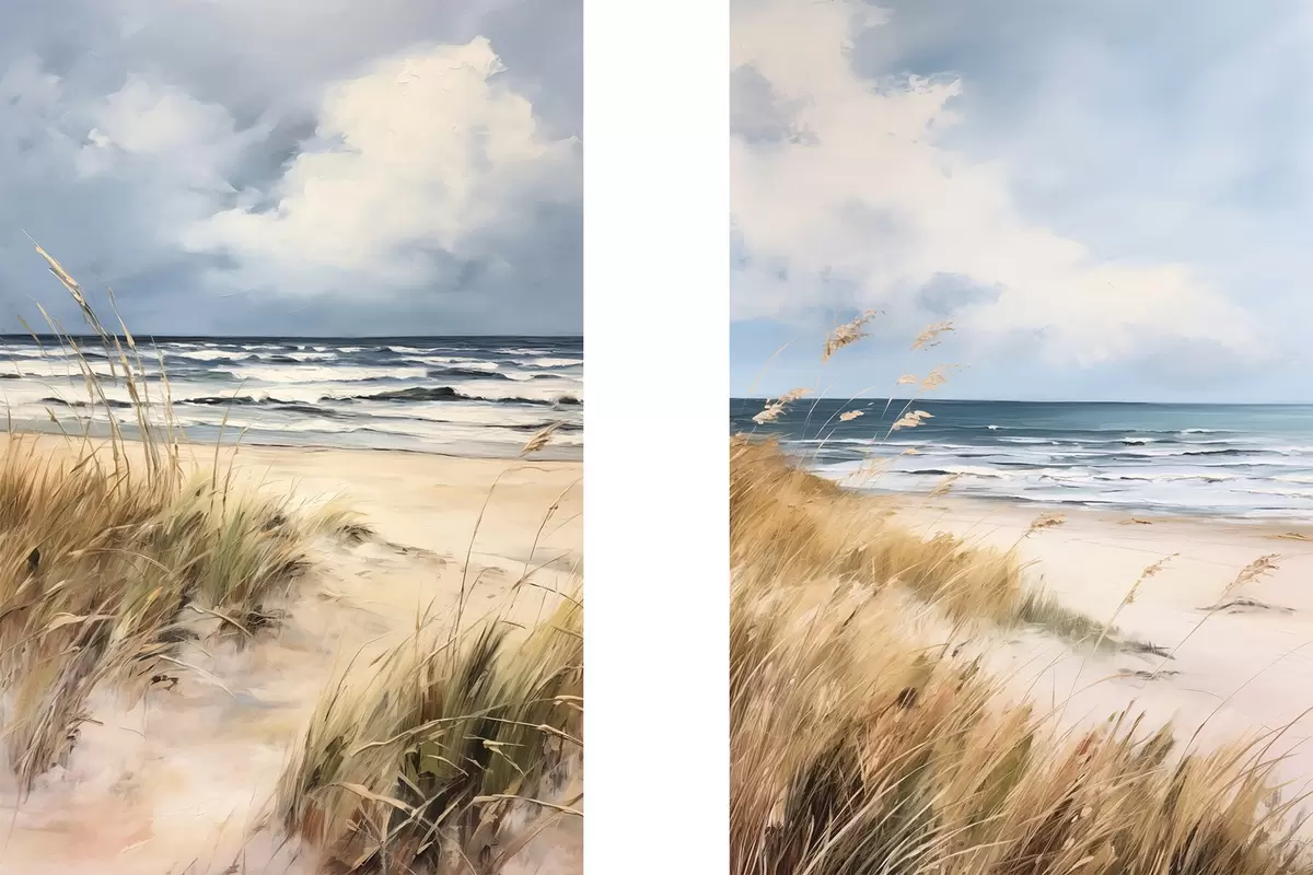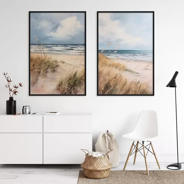 Plakatas Smėlėtas paplūdimys su aukšta žole pirmame plane, vandenynas su bangomis ir debesuotas dangus antrame plane Ne d00521