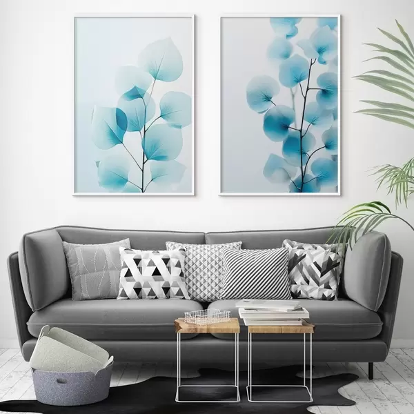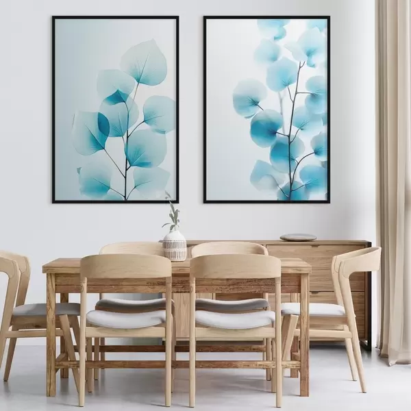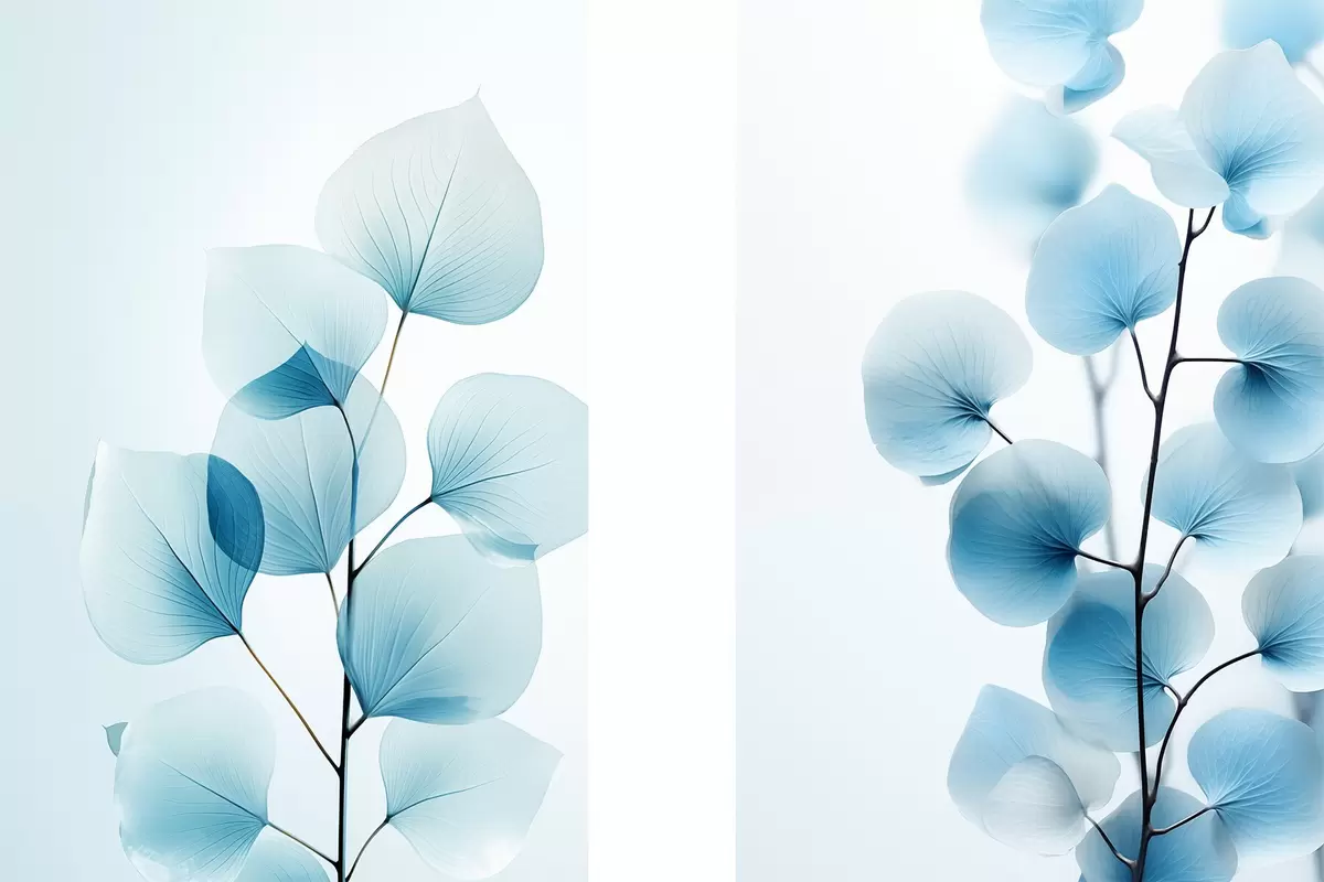 Plakatas Šaka su permatomais mėlynais lapais, matomos subtilios gyslos, lengva ir rami kompozicija, minimalistinė estetika Ne d00522