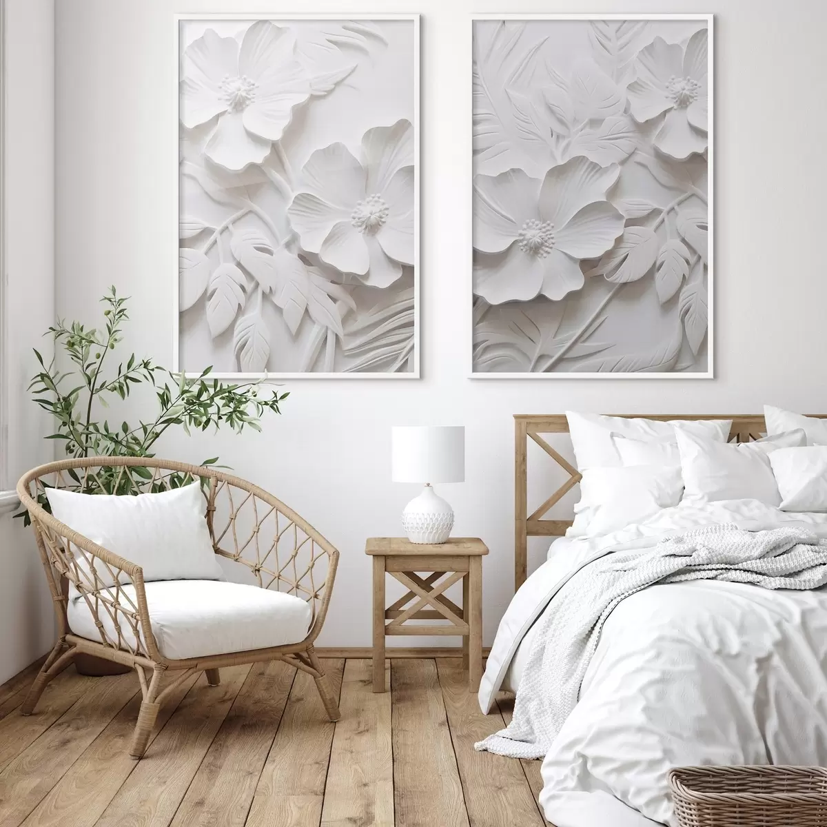 Plakatas Dekoratyvios minimalistinės baltos gėlės su lapais, reljefo imitacija, baltas fonas d00524
