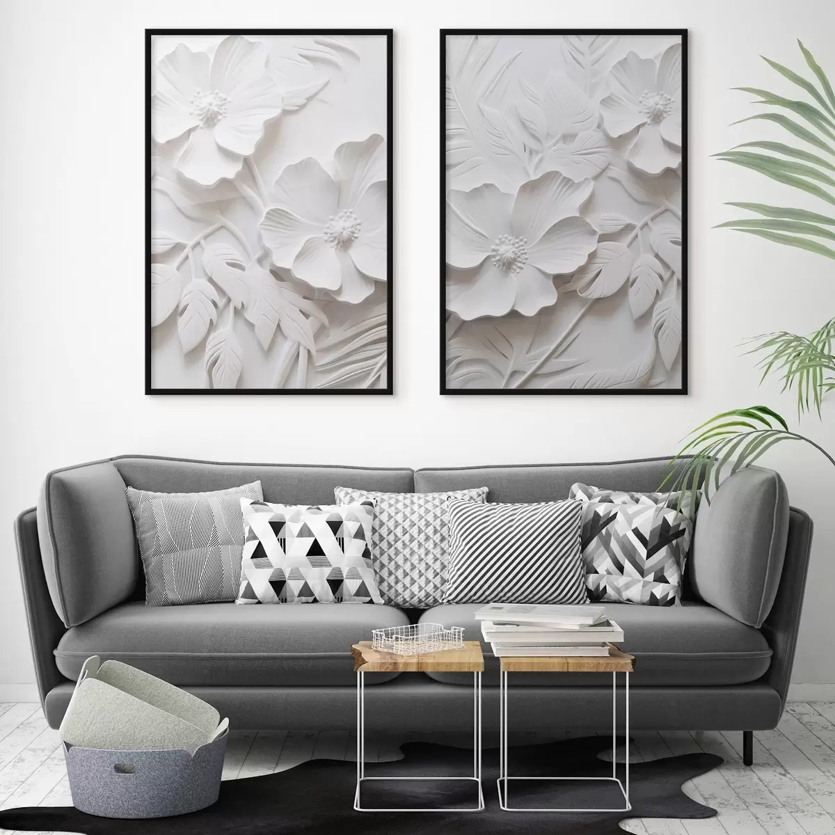 Plakatas Dekoratyvios minimalistinės baltos gėlės su lapais, reljefo imitacija, baltas fonas Ne d00524