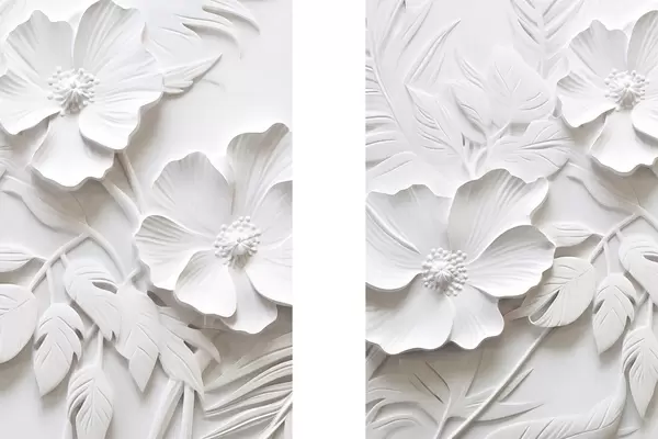 Plakatas Dekoratyvios minimalistinės baltos gėlės su lapais, reljefo imitacija, baltas fonas d00524