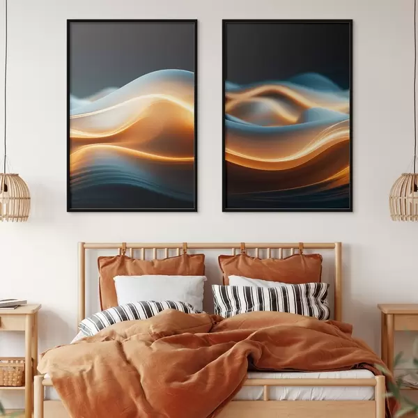 Plakatas Abstrakčios tekančios formos su oranžinėmis linijomis, sklandžios kreivės ir linijos, dinamiška kompozicija, tamsus fonas Ne d00526