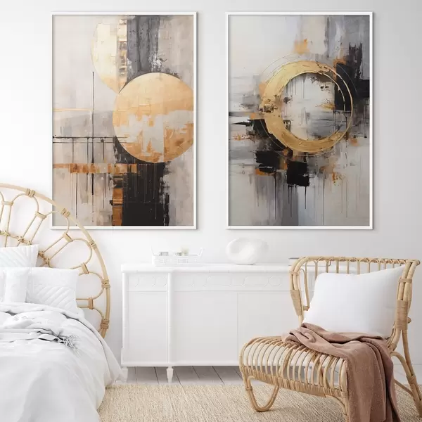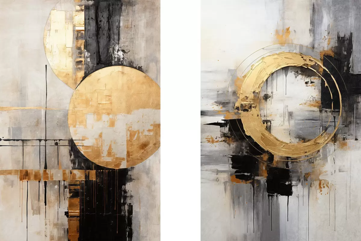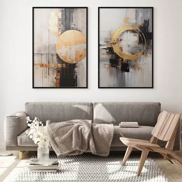 Plakatas Abstraktus paveikslas su apskritimais, juodomis ir geltonomis linijomis bei pilkų ir baltų tonų fonu Ne d00527