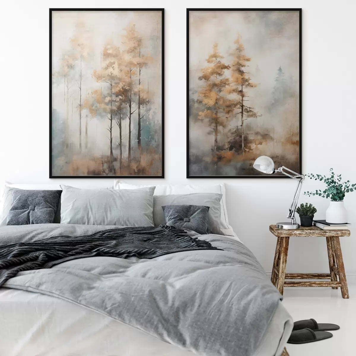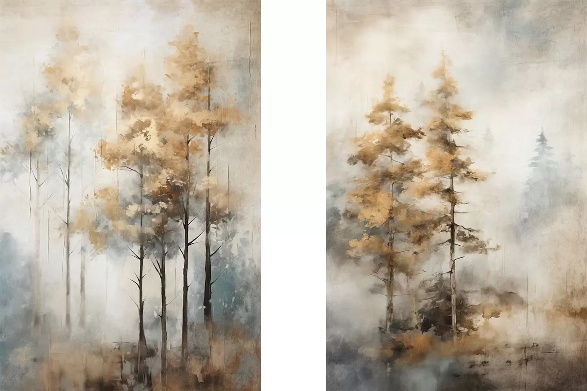 Plakatas Tekstūruoti aukšti medžiai su geltonais lapais miške , fone susipina švelnūs mėlyni ir rudi tonai Ne d00528