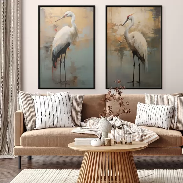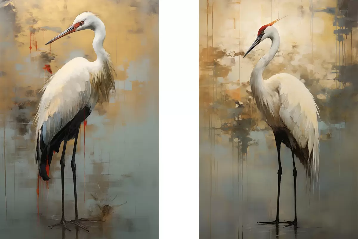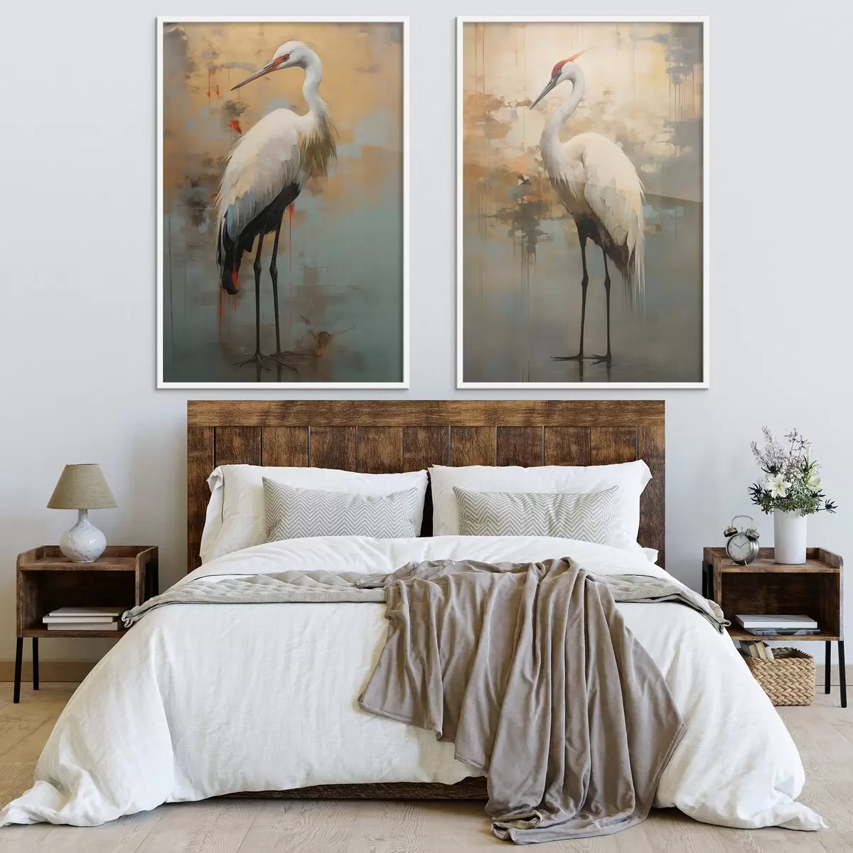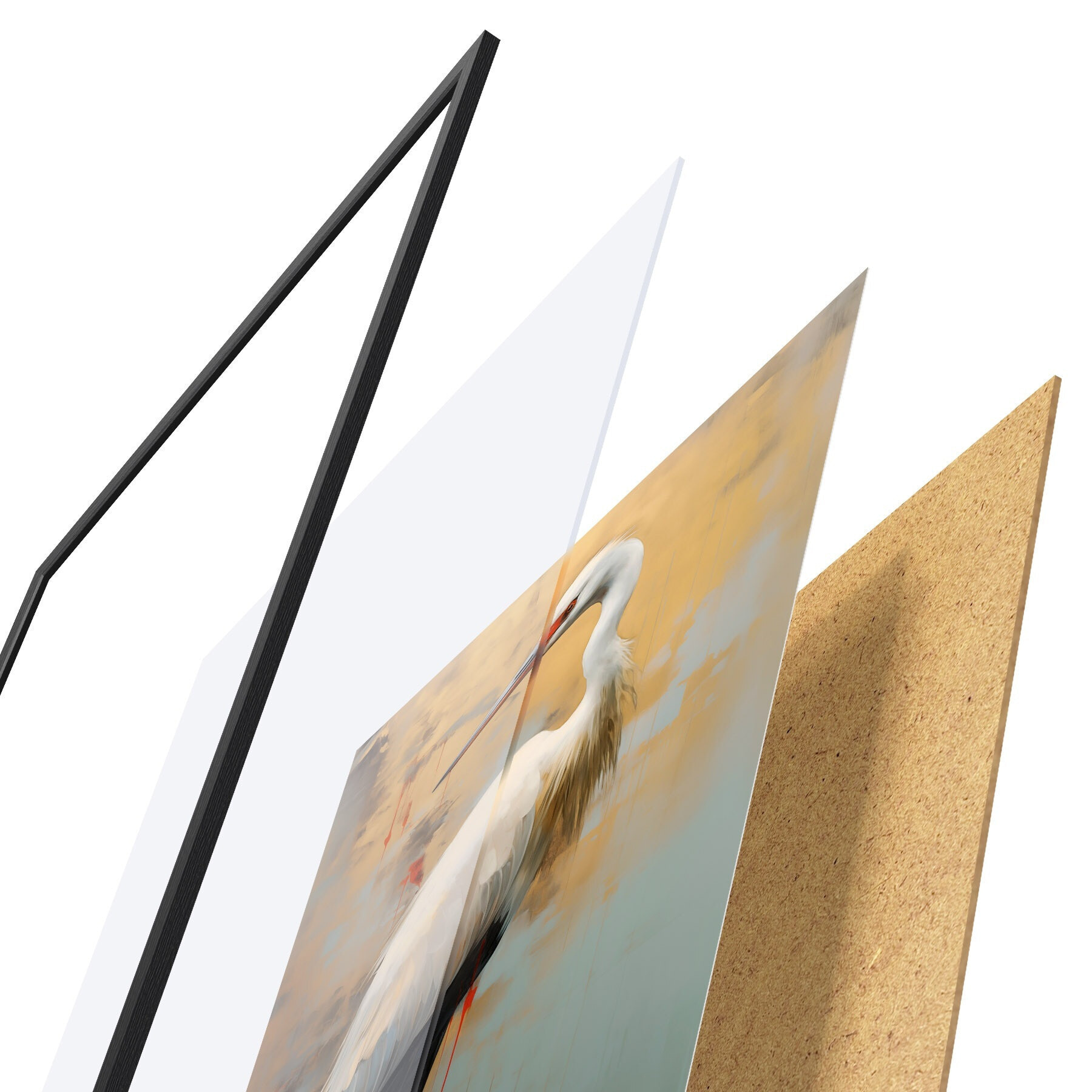 Plakatas Baltasis garnys prislopintų geltonų, rudų ir mėlynų atspalvių fone, primenančiame miglotą abstraktų peizažą d00530