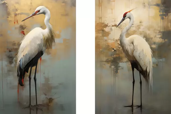 Plakatas Baltasis garnys prislopintų geltonų, rudų ir mėlynų atspalvių fone, primenančiame miglotą abstraktų peizažą d00530