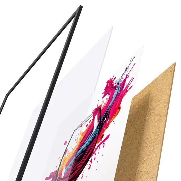 Plakatą sudaro rėmas, pleksiklas, atspausdintas vaizdas ir medžio drožlių plokštės pagrindas. Plakatą galima iš karto pakabinti ant sienos dėl kitoje pusėje esančių laikiklių.
