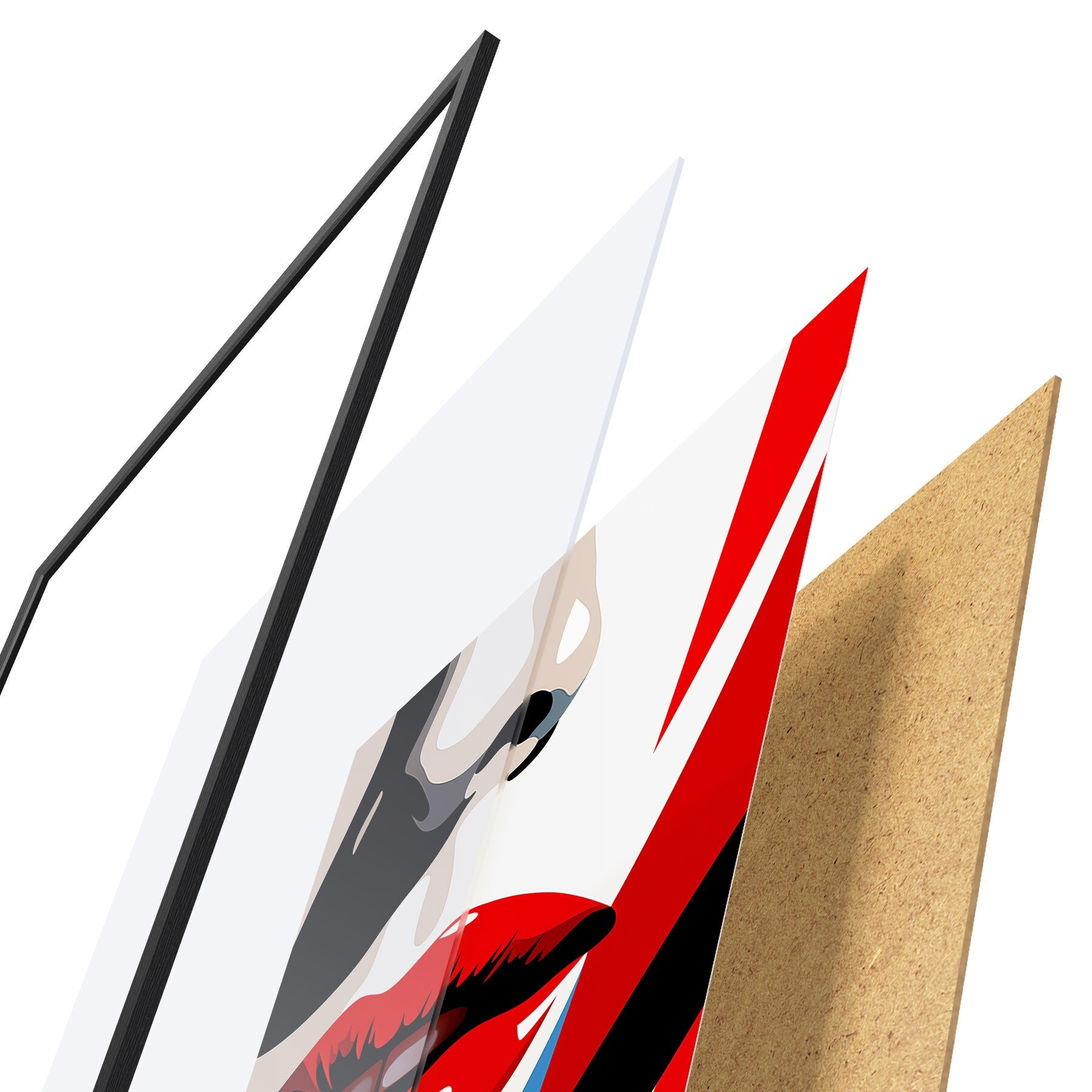 Plakatą sudaro rėmas, pleksiklas, atspausdintas vaizdas ir medžio drožlių plokštės pagrindas. Plakatą galima iš karto pakabinti ant sienos dėl kitoje pusėje esančių laikiklių.