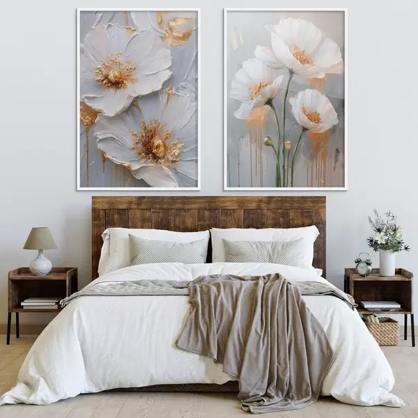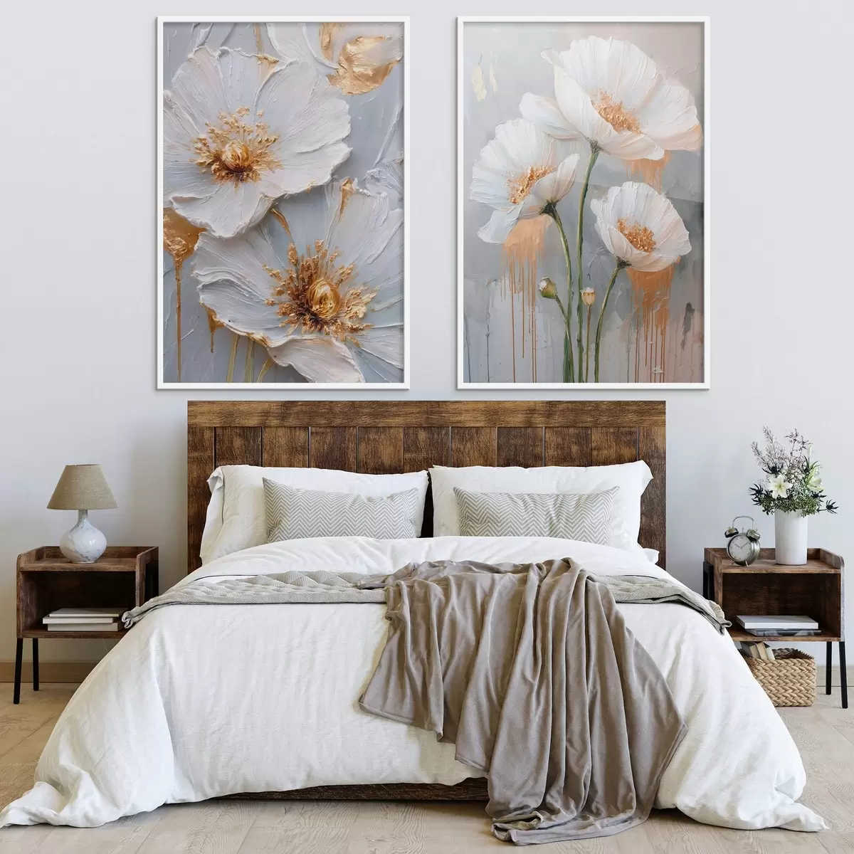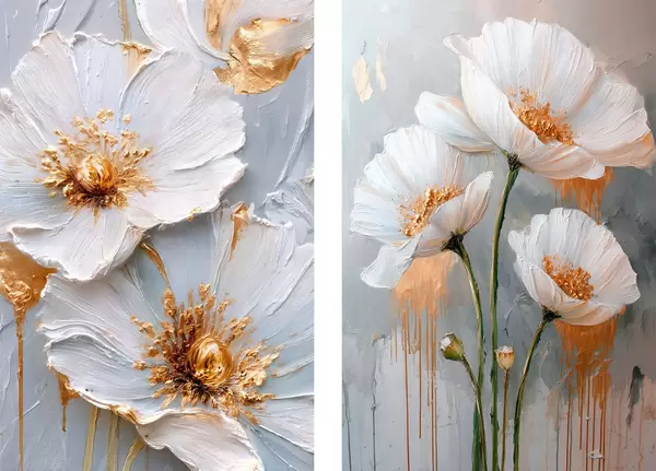 Plakatas Baltų gėlių su auksiniais akcentais pilkame fone tūrinis paveikslas d00568