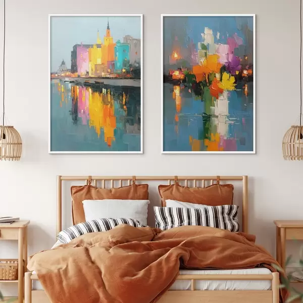 Plakatas Miesto dinamika: abstrakti kompozicija su šviesų atspindžiais upėje Ne d00569
