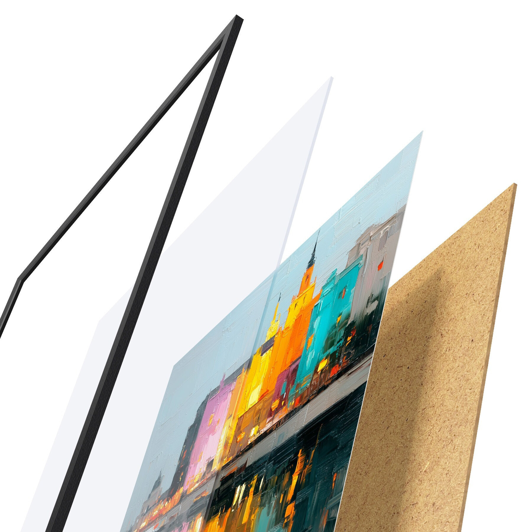 Plakatą sudaro rėmas, pleksiklas, atspausdintas vaizdas ir medžio drožlių plokštės pagrindas. Plakatą galima iš karto pakabinti ant sienos dėl kitoje pusėje esančių laikiklių.