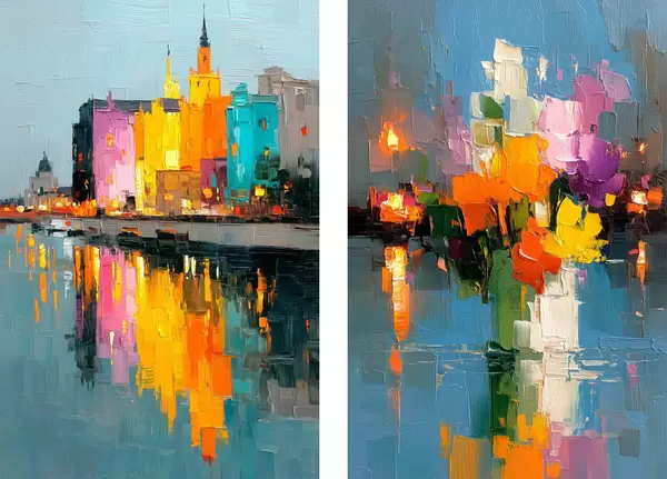 Plakatas Miesto dinamika: abstrakti kompozicija su šviesų atspindžiais upėje Ne d00569