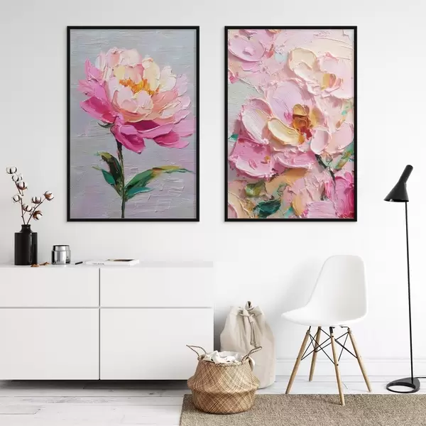 Plakatas Šiuolaikinis menas su rausvomis gėlėmis, atliktas tūrine technika d00572