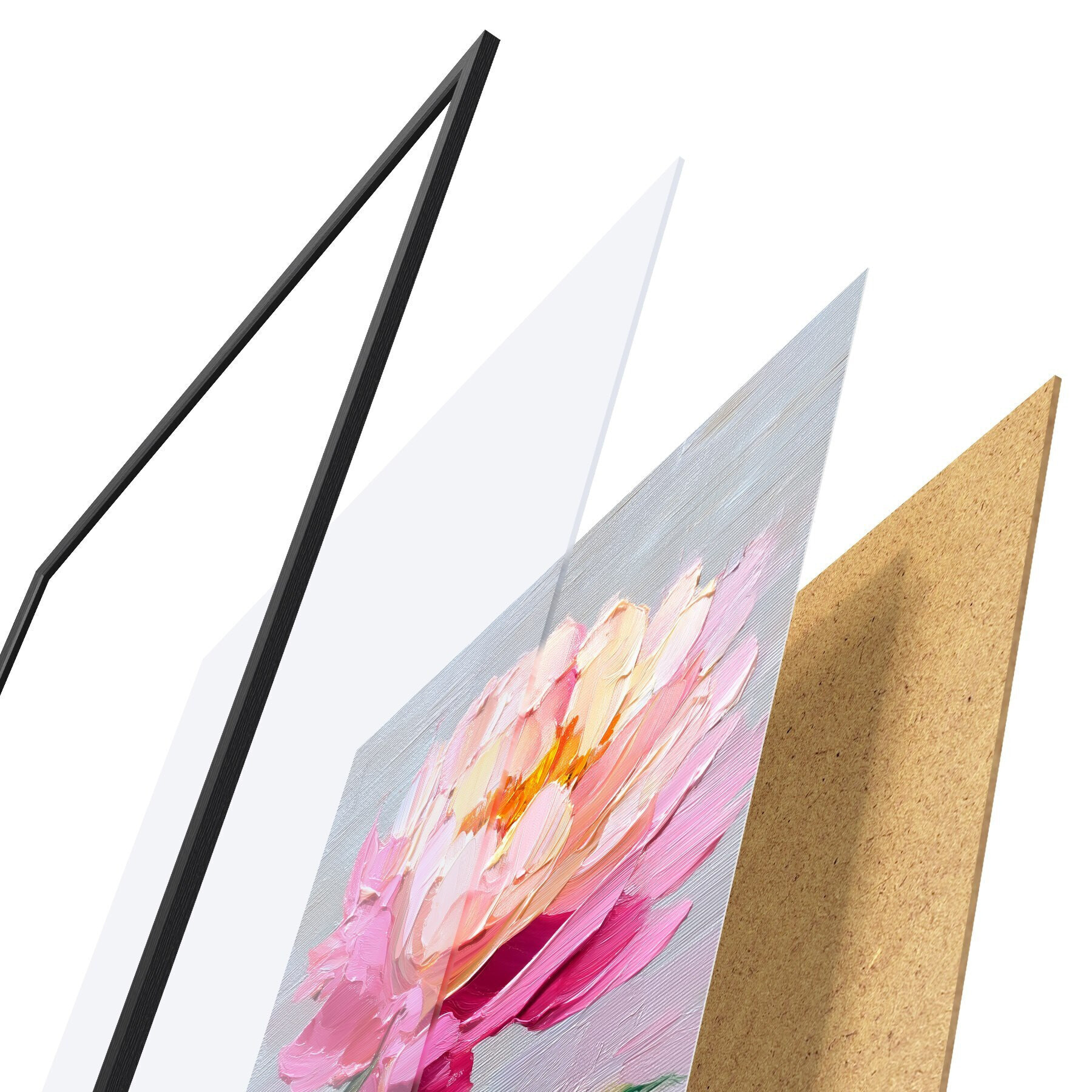 Plakatą sudaro rėmas, pleksiklas, atspausdintas vaizdas ir medžio drožlių plokštės pagrindas. Plakatą galima iš karto pakabinti ant sienos dėl kitoje pusėje esančių laikiklių.