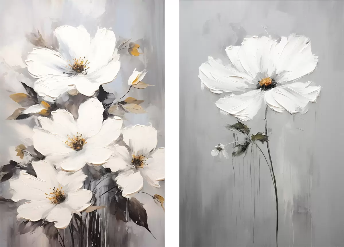 Plakatas Meninė kompozicija su baltomis gėlėmis ir tekstūriniu paviršiumi minimalistiniu stiliumi d00574