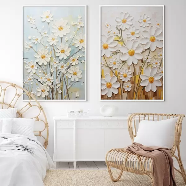 Plakatas Saulėtos gėlės: meno duetas su tūriniais margučiais ir geltonais akcentais d00580