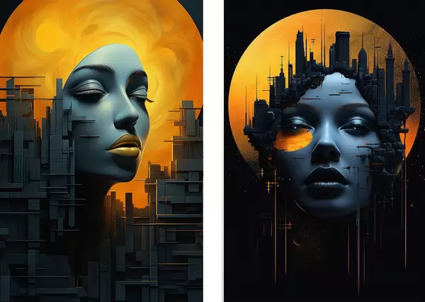Plakatas Mergaitės portretas abstrakčiame miesto fone d00618
