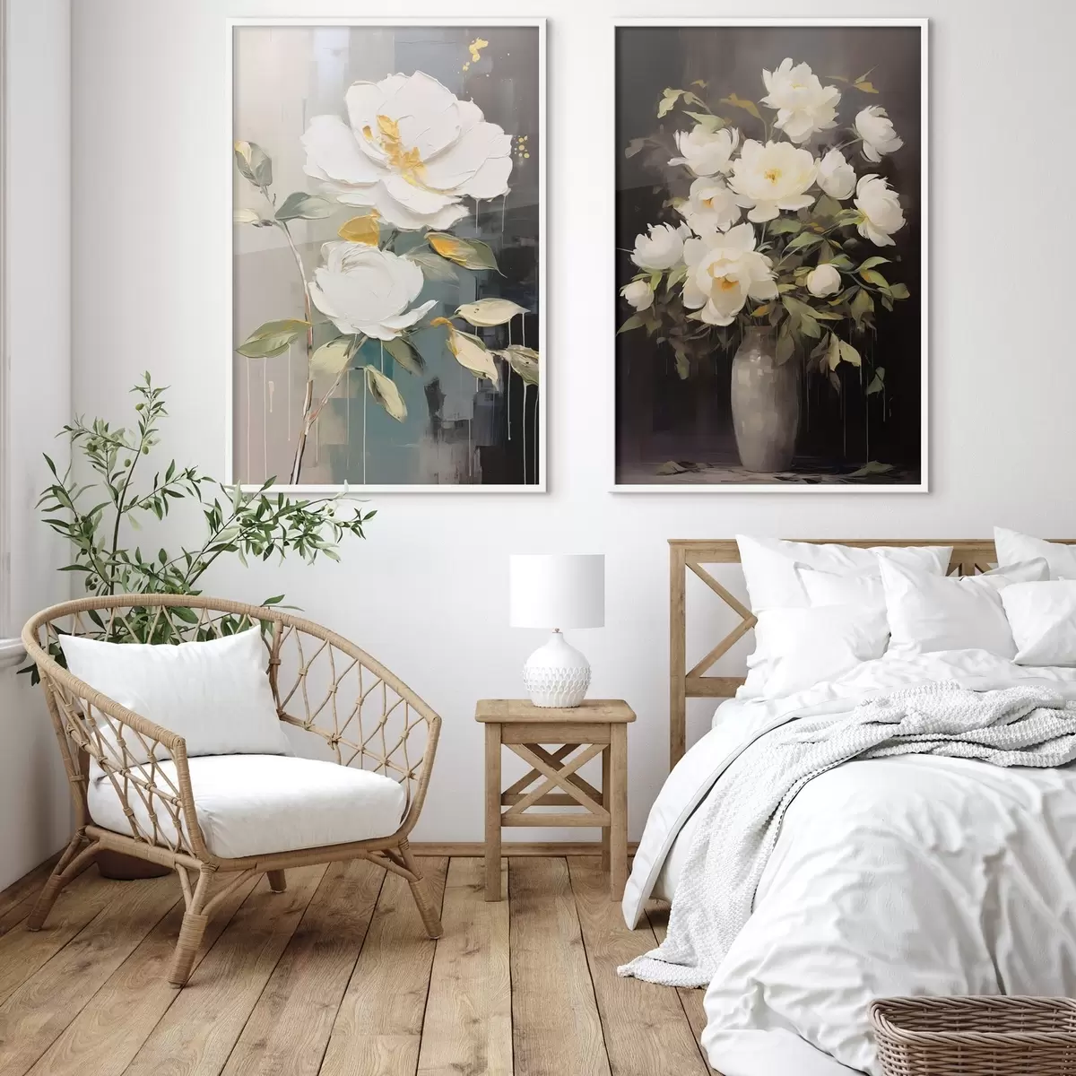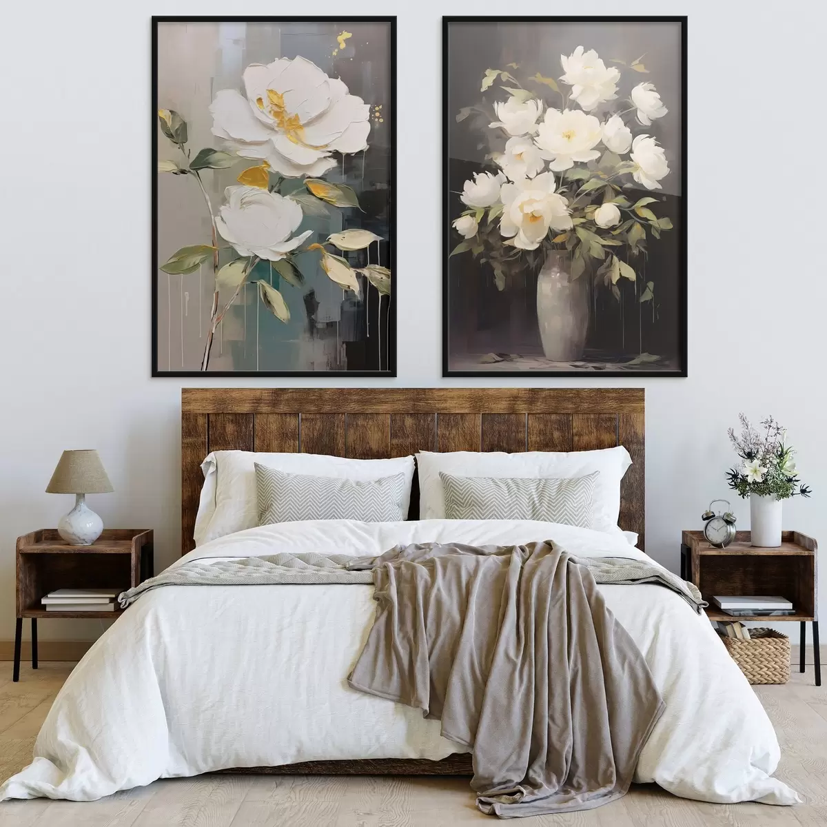 Plakatas Balti bijūnai tamsiame fone: dekoratyvinė kompozicija d00634