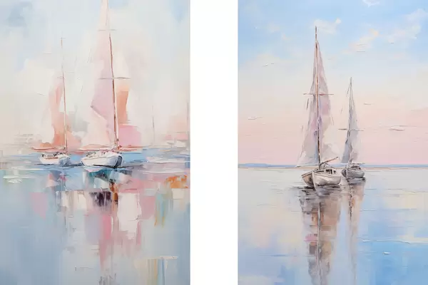 Plakatas Ramioje jūroje plaukiojančios burinės valtys su rausvomis burėmis, valčių atspindžiai vandenyje, švelnios pastelinės spalvos Ne d00648