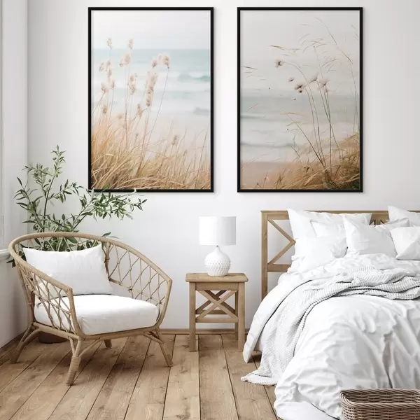 Plakatas Aukšta žolė su pūkuotomis sėklų galvutėmis, smėlio paplūdimys ir vandenyno bangos fone, švelni ir prislopinta spalvų paletė d00650