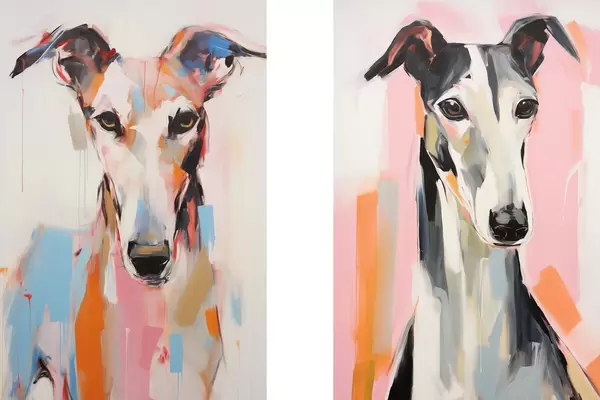 Plakatas Ryškiomis spalvomis, pavyzdžiui, oranžine, rožine ir mėlyna, nudažytas greihaundų veislės šuo vienspalviame baltame fone d00652