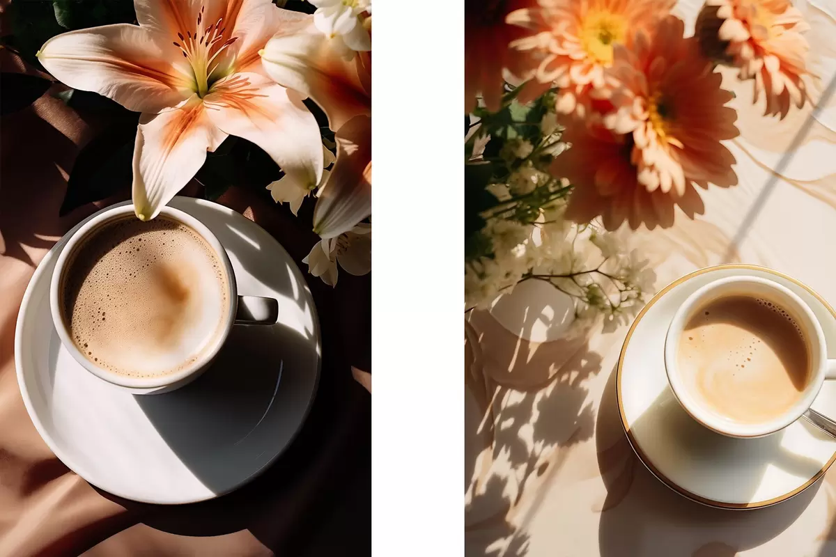 Plakatas Kavos puodelis su puta ant baltos lėkštės, gėlės fone, saulės šviesoje d00654