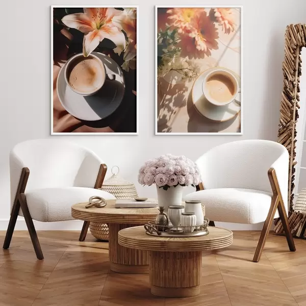 Plakatas Kavos puodelis su puta ant baltos lėkštės, gėlės fone, saulės šviesoje Ne d00654